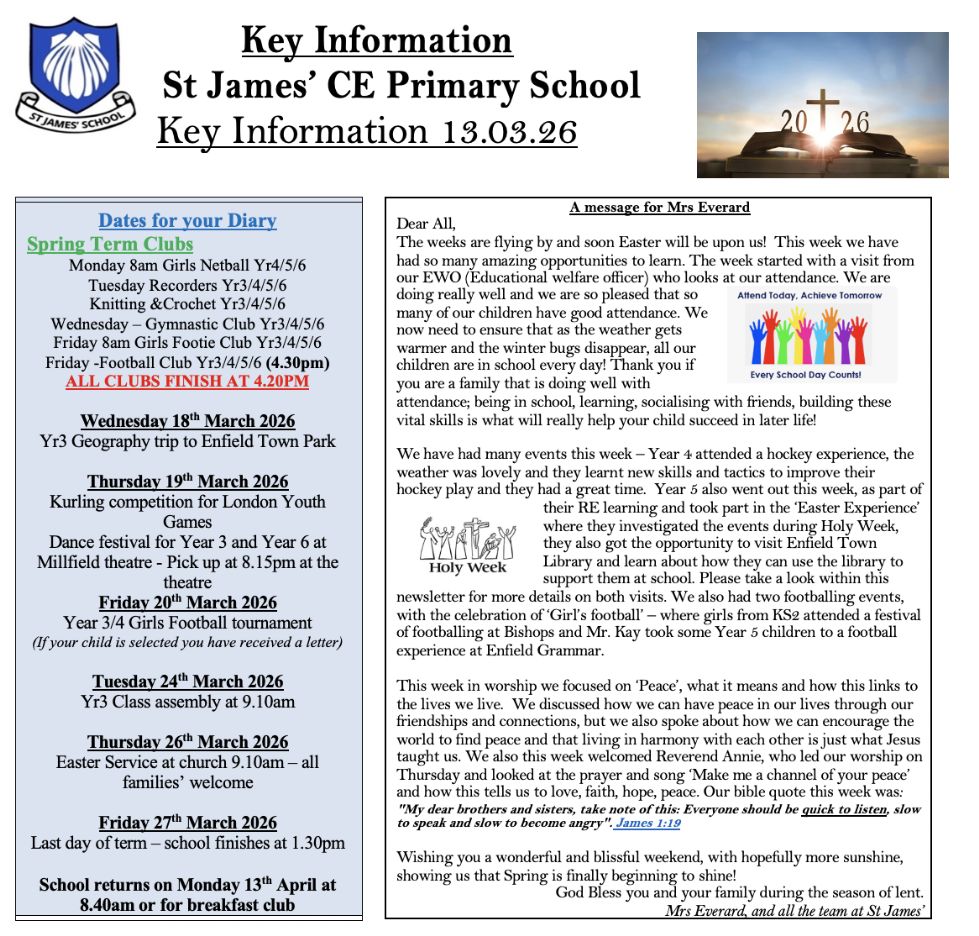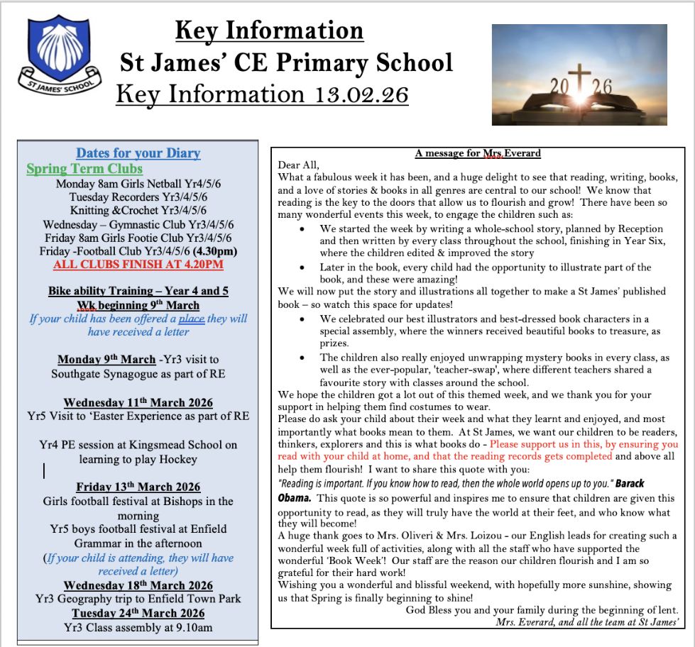 St James' CE Primary School is a one-form entry school in Enfield closely linked to St James’ Church, this link enables our children to flourish and learn from Christian values which are so important to us.