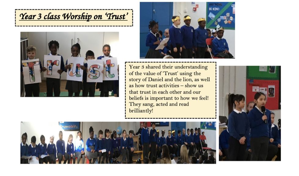 Throughout the week, worship is a time for us to be together as a community. Collective Worship is led by the Executive head once a week through singing worship and the Head of School through the Christian timetable and that of our vision and values. Each term, a class led collective worship takes place as each class are the ambassadors for the 1/2 termly value. We also have 'Pathways', a Christian organisation that come in once a 1/2 term to lead collective worship and teach the children an aspect of learning from the bible. Here are some images from our collective worships that have been led by our children: