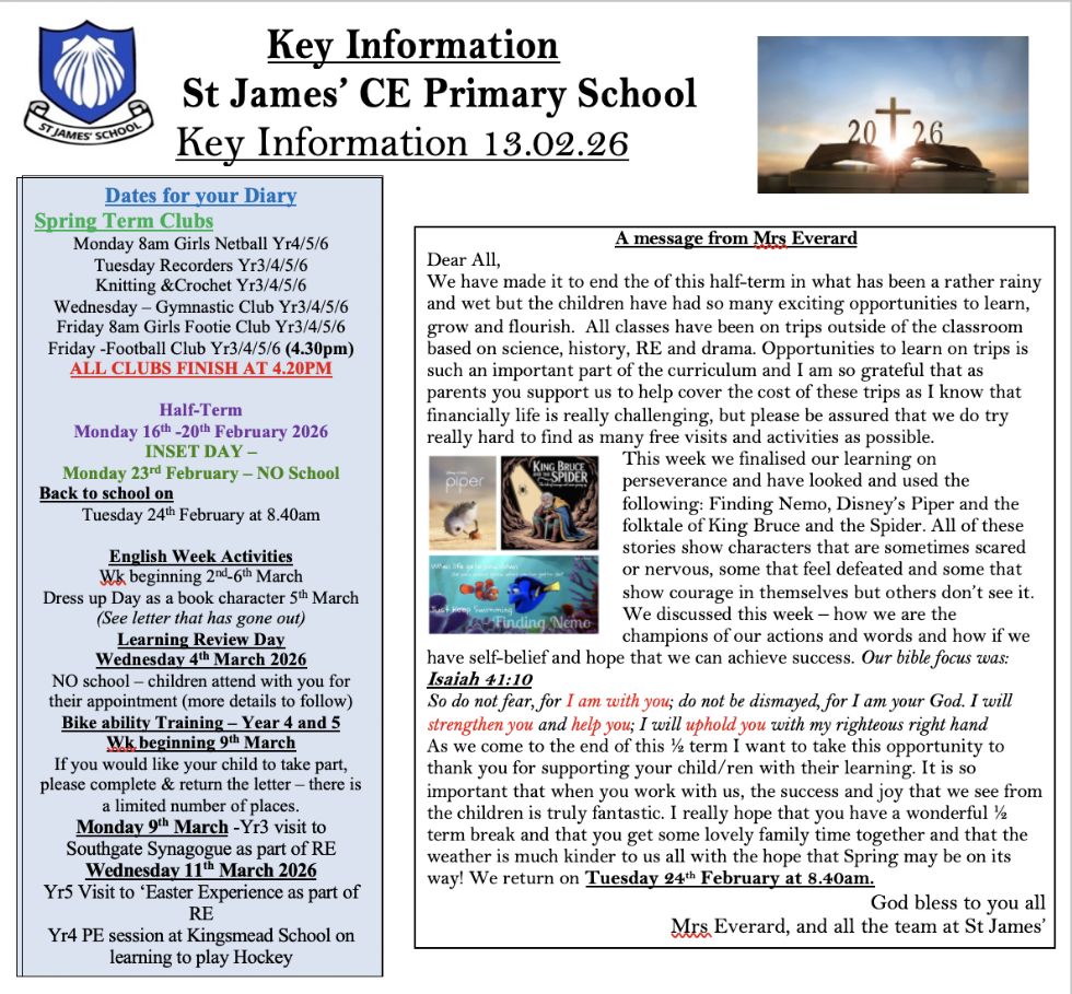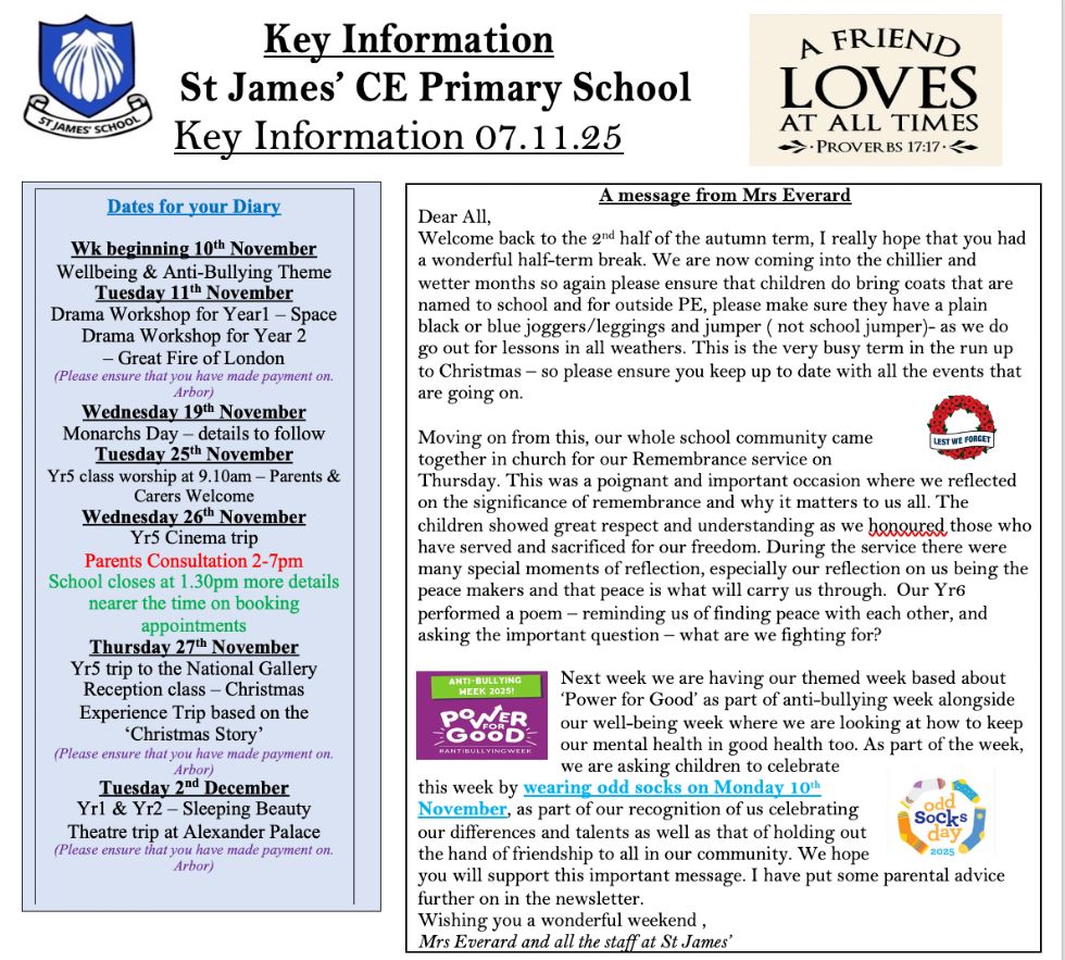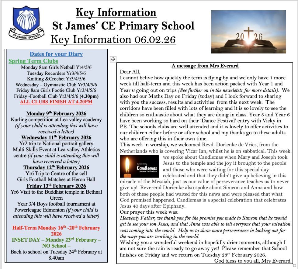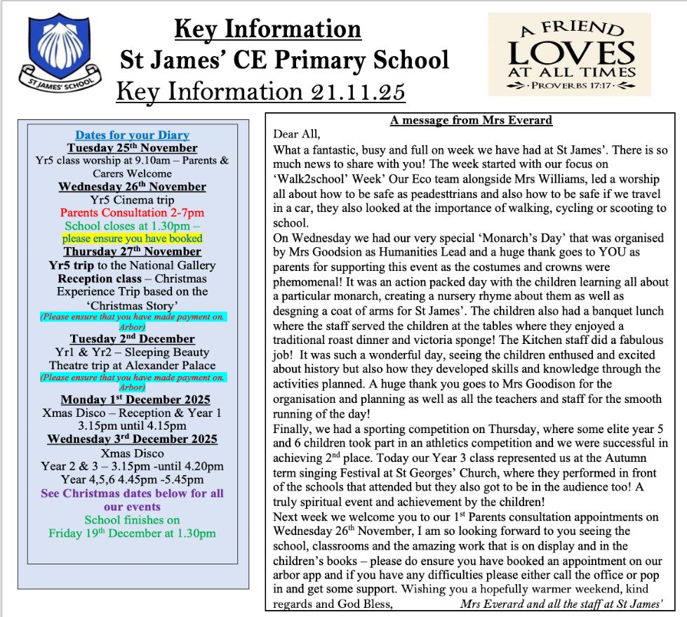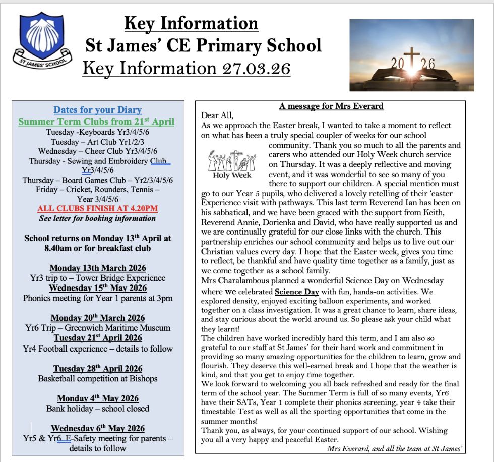 If you are considering St James’ as the school for your child or children please visit the 'our school' section of our website, and call to arrange a visit.